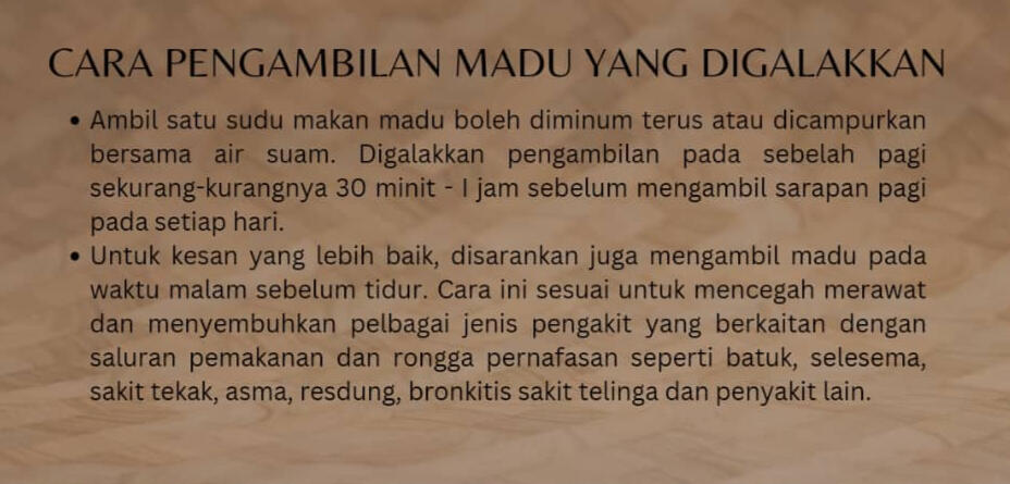 Kami komited untuk memberi kesedaran pengambilan, menghasilkan, membekalkan, dan membanggunkan produk madu lebah asli serta latihan.
